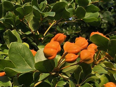 Yellow‑orange fruits follow flowering, inside which are bright purple seeds.